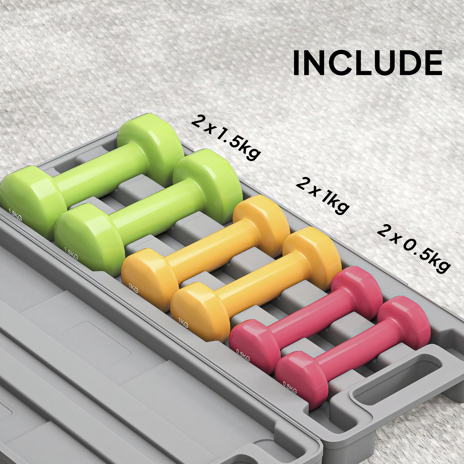 - Three pairs of colourful dumbbells, weighing 0.5kg, 1kg and 1.5kg respectively, satisfying your different training needs