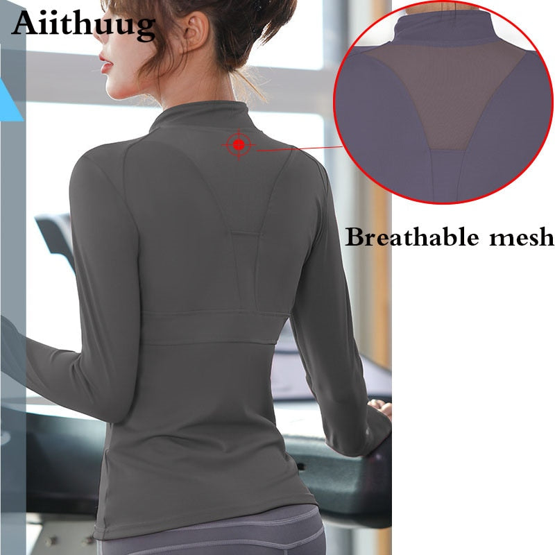 Aiithuug Women's Zipper Long Sleeve Stretchy Thumb Hole Workout Sports Jacket Shirt Breathable Mesh Running Sports Fitness