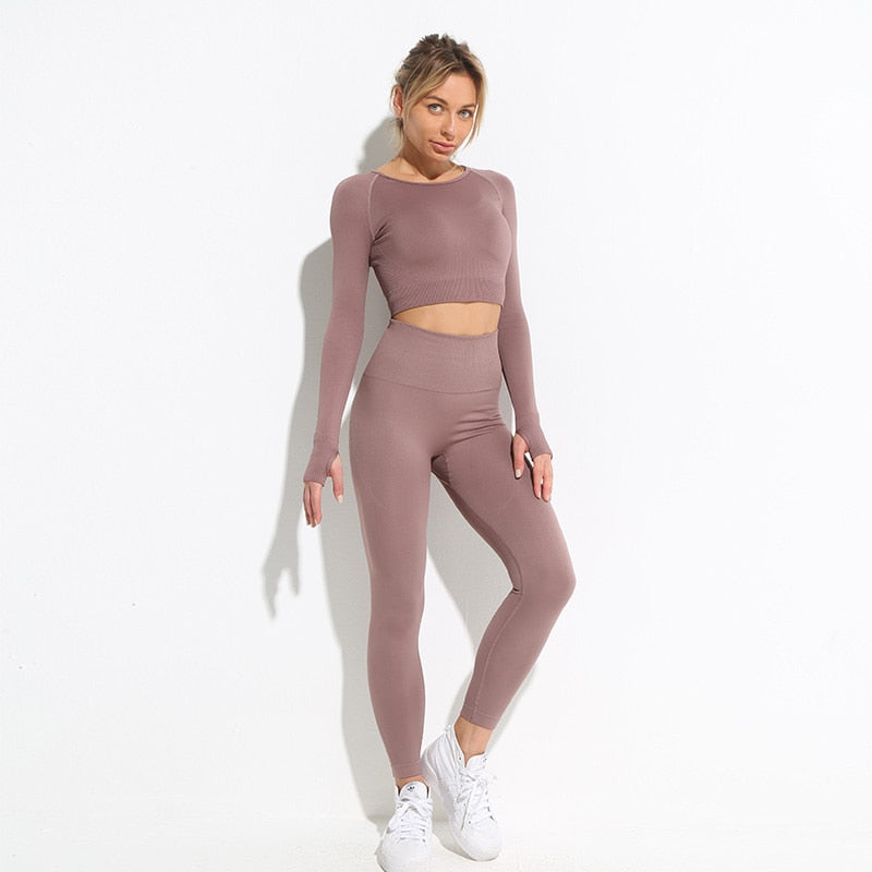 2 pieces seamless hyperflex workout sport outfits for women sportswear athletic clothes gym Long Sleeve Crop Top High Waist Leggings