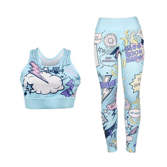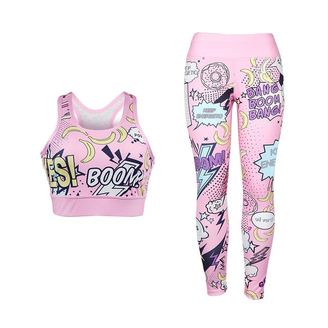 IWUPARTY 2 Piece Cute Pink Printing Yoga Set Women Workout Gym Outfit Sets Sport Fitness Crop Top Leggings Running Ladies Suit