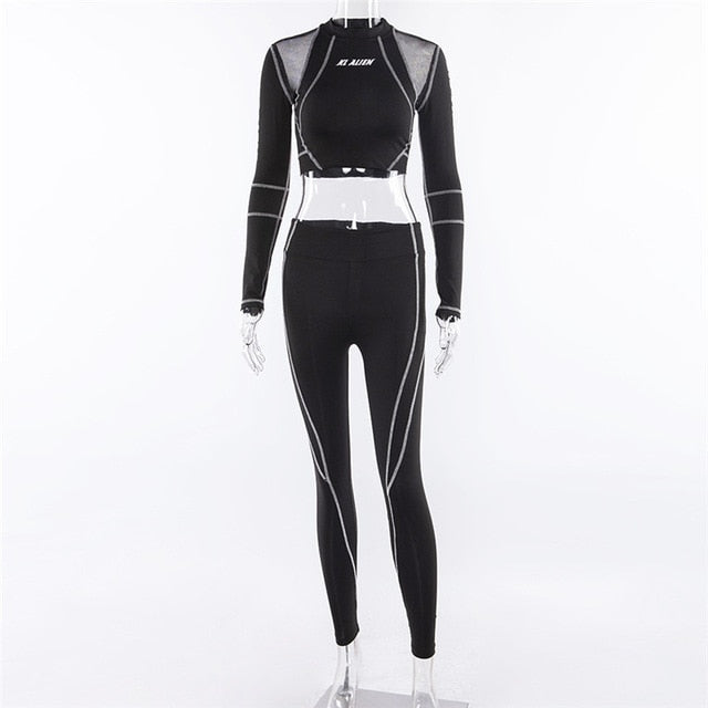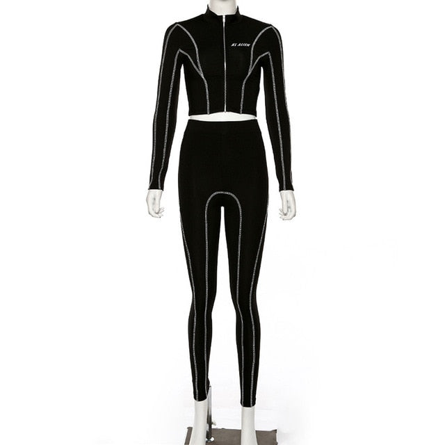 LAISIYI Women Fitness Sport Two Pieces Set Letter Print Turtleneck Top Leggings Striped Patchwork 2019 Fashion 2 Pcs Tracksuits
