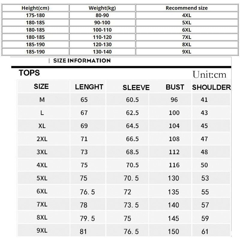 Height(cm) Weight(kg) Recommend size 175-180 80-90 4XL 180-185 90-100 5XL 180-185 100-110 6XL 180-185 110-120 7XL 185-190 120-130 8XL 185-190 130-140 9XL