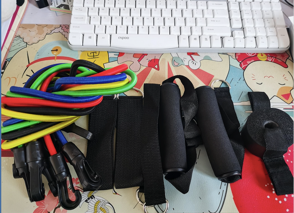 - 5 * elastic bands: black (30 lbs), blue (25 lbs), red (20 lbs), green (15 lbs), yellow (10 lbs)