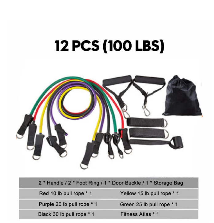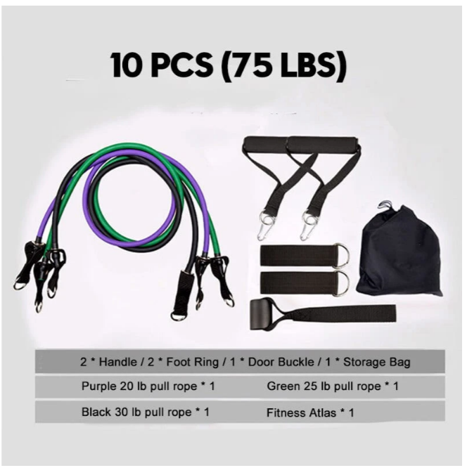 2 * handle / 2 * foot ring / 1 * door buckle / 1 * storage bag / 1 * Fitness Atlases / 1 * red 10 lb traction rope / 1 * yellow 15 lb traction rope / 1 * Purple 20 lb tow rope / 1 * green 25 lb tow rope / 1 * black 30 lb tow rope