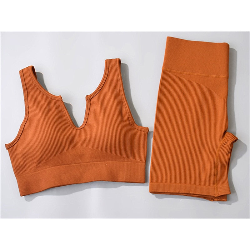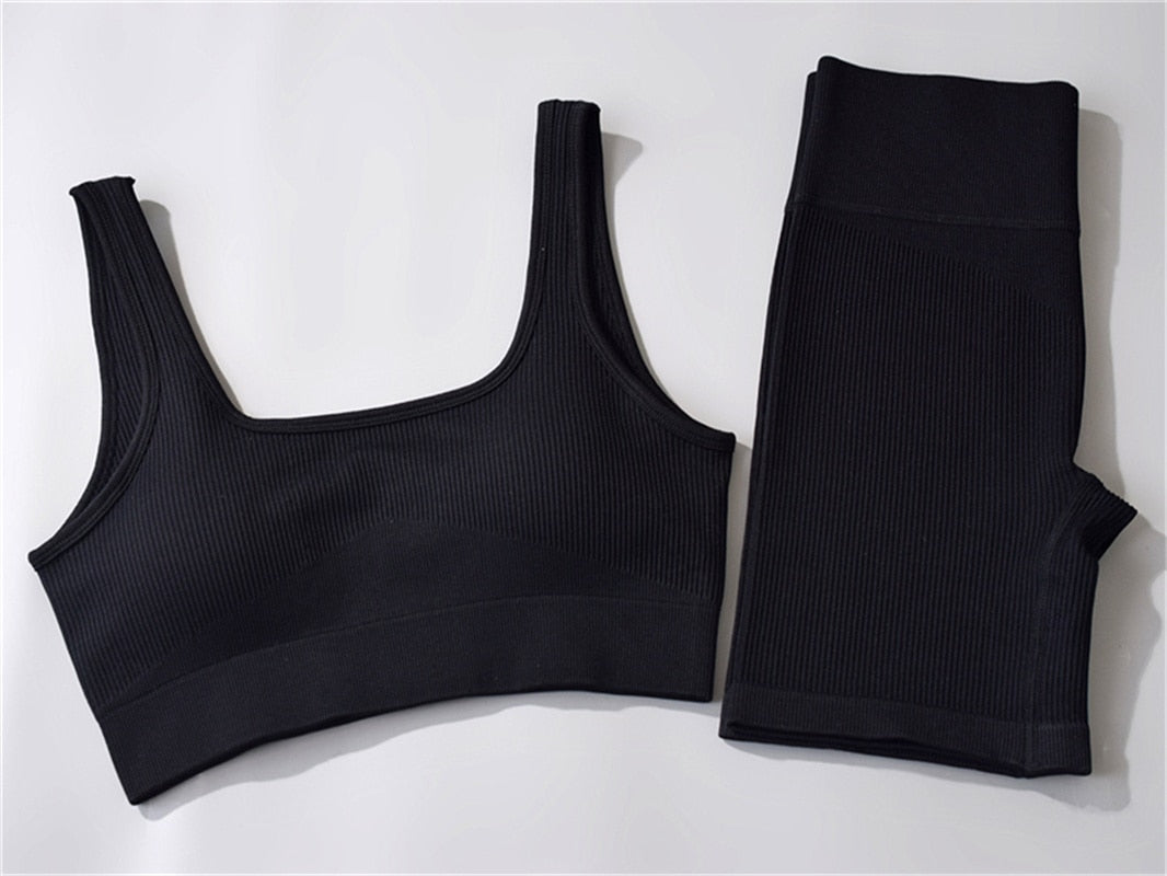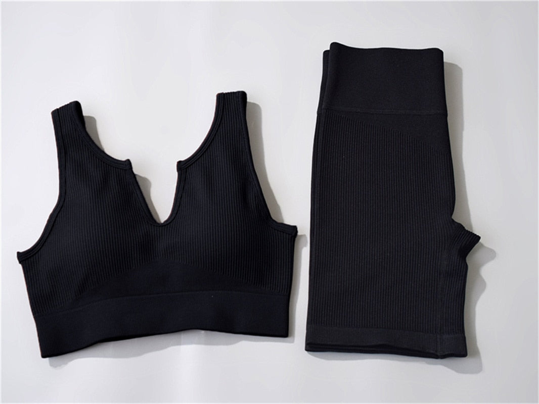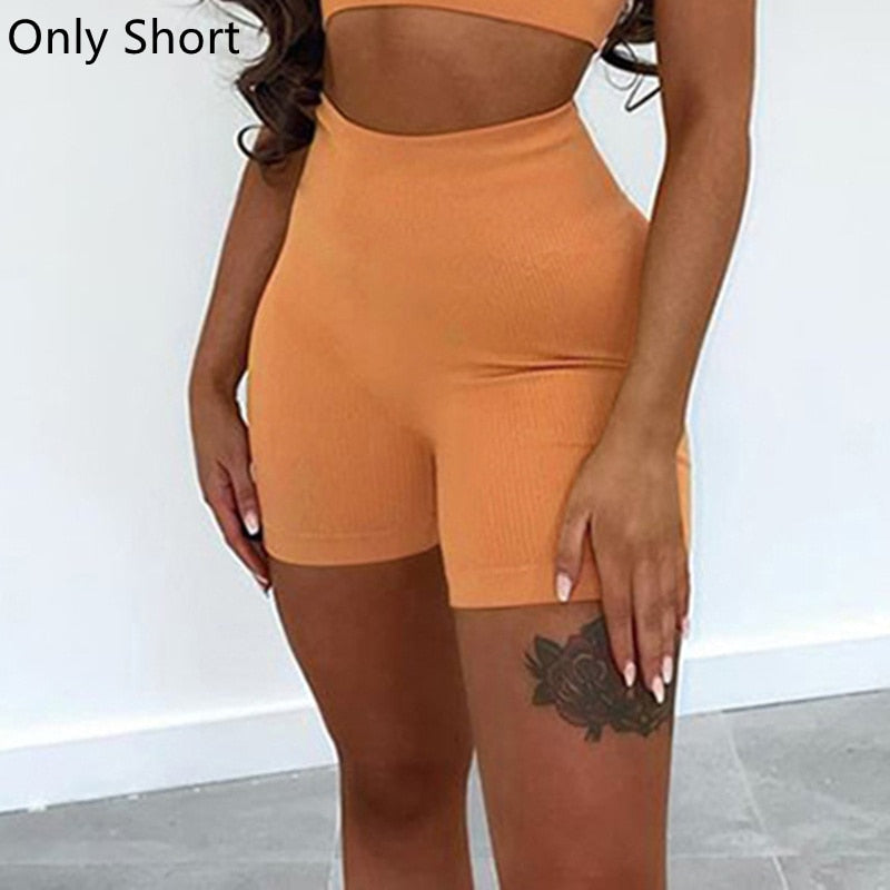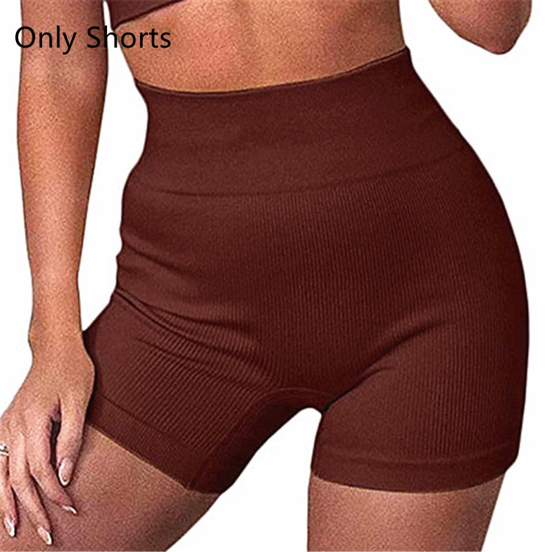 Ribbing Seamless Sport Set Women Two Piece Crop Top Bra Shorts Workout Outfit Fitness Wear GymSuit Female Yoga Sets Clothes