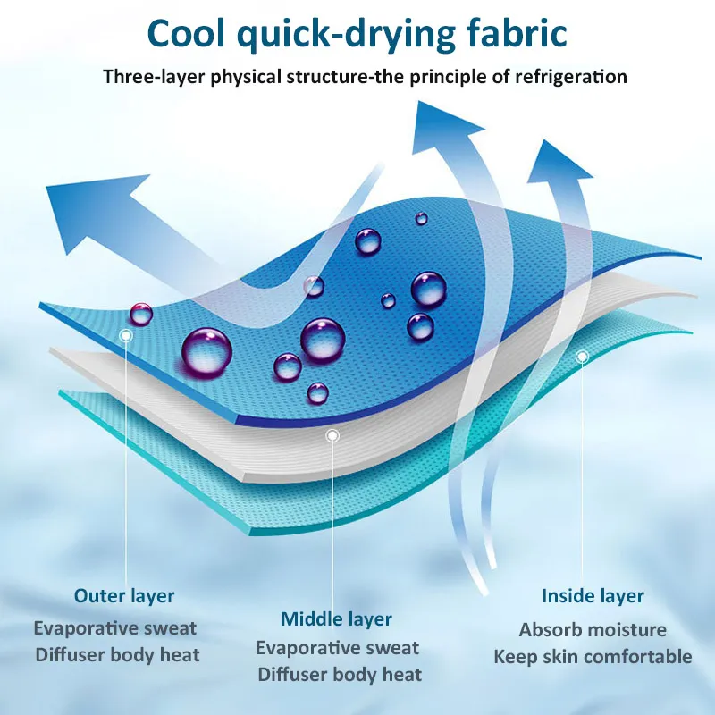 ABSORBENT AND BREATHABLE , the special mesh fabric retains enough water that is required for the cooling effect. And it is breathable and comfortable to the skin.