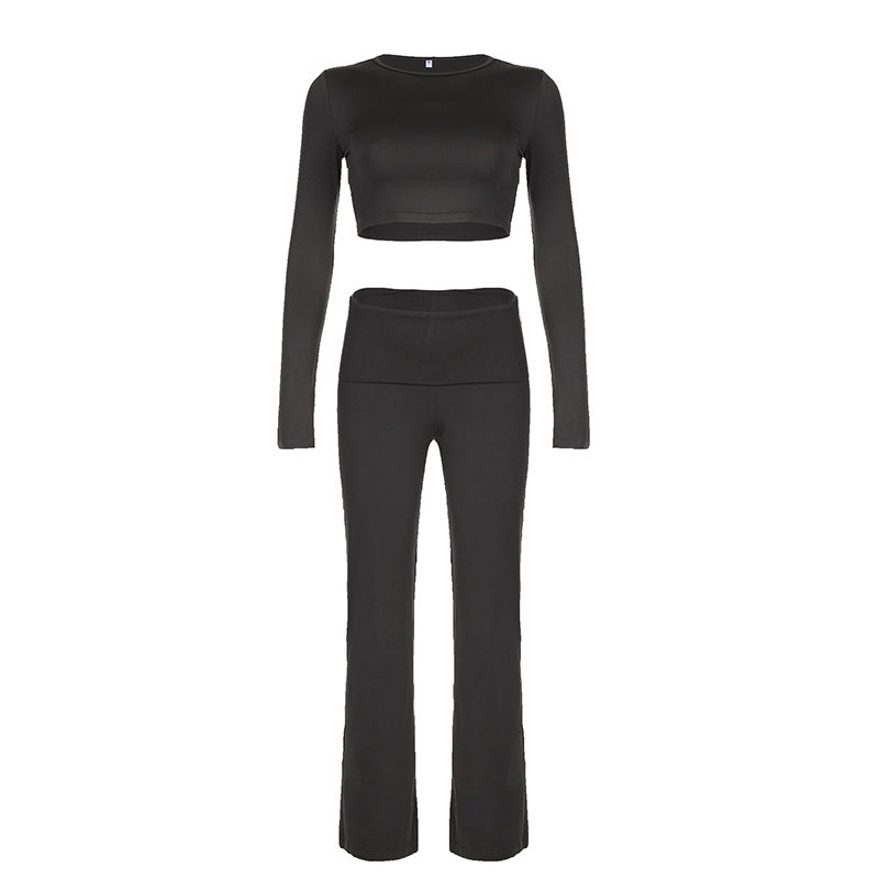 Sports Solid Color Round Neck Short Top Bootcut Trousers Fitness Yoga Two-piece Set For Women